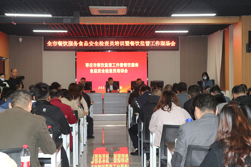 為進(jìn)一步豐富餐飲服務(wù)食品安全檢查員業(yè)務(wù)知識,提升全市餐飲環(huán)節(jié)食品安全監(jiān)管水平,棗莊市市場監(jiān)督管理局根據(jù)2023年餐飲監(jiān)管工作計劃,于11月8日,在臺兒莊古城學(xué)校召開全市餐飲監(jiān)管工作暨餐飲服務(wù)食品安全檢查員培訓(xùn)會議,市、區(qū)兩級局分管局長、餐飲科全體人員、全市餐飲服務(wù)食品安全檢查員參加。會議由市市場監(jiān)管局副局長張衍耀主持;臺兒莊區(qū)委常委、副區(qū)長孫作偉致辭,并介紹建設(shè)“食安臺兒莊”的經(jīng)驗和做法;山東省市場監(jiān)管局餐飲處一級調(diào)研員遲玉聚博士,作《深刻學(xué)習(xí)領(lǐng)會習(xí)近平總書記重要論述精神努力守住食品安全底線》主題報告。